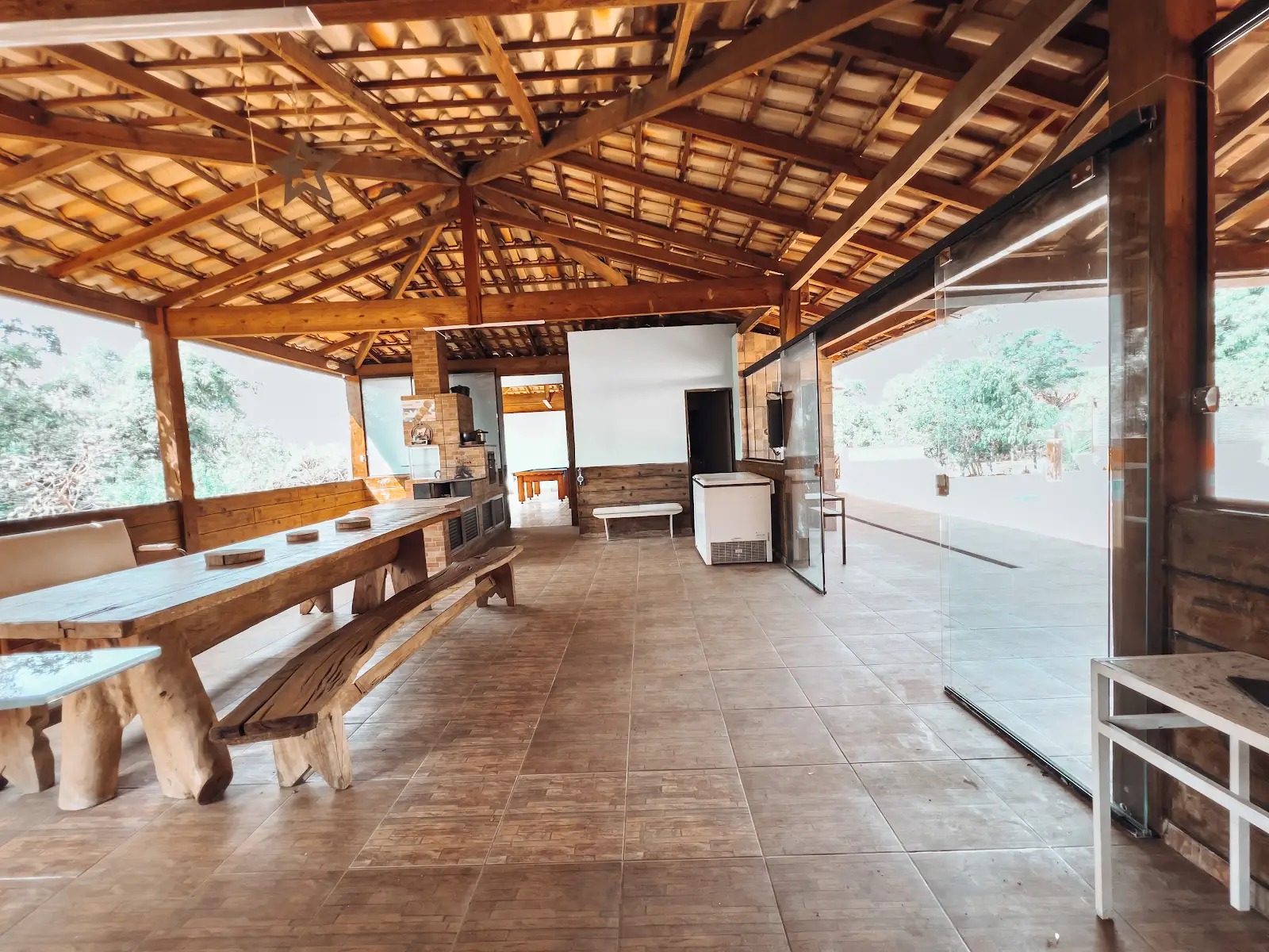 Fogão a gás, forno a lenha, airfryer, panelas de pressão, freezer e churrasqueira com todos os acessórios. Pensada para refeições em grupo e aquela churrascada inesquecível.